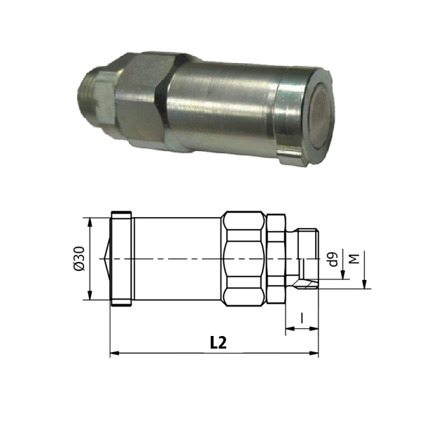 MALE - samec -vsuvka pro Rychlospojka označenou FEMALE*. Tato rychlospojka s bajonetovým zámkem je určena k rychlému spojení a rozpojení potrubí hydraulických soustav zemědělských, stavebních, lesnických a dalších strojů a zařízení. Předností této rychlospojky je především její konstrukce přizpůsobená těžkým provozním podmínkám, odolnost proti poškození, nízká tlaková ztráta a nepatrný únik oleje při spojení a rozpojení. D* - průměr těla rychlospojky.