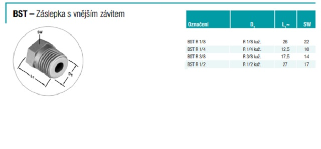 VariantyBST-R1/8; Provozní tlak (bar) 10, Vnější závit R 1/8", Hmotnost (kg) 0,002, Šestihran 10