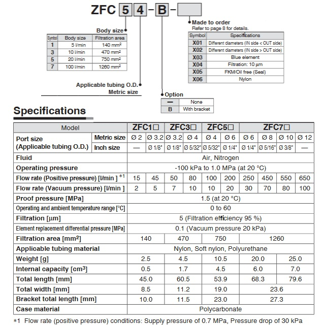 VariantySMC-ZFC11; Podtlak (kPa) 100, Provozní tlak (bar) 10, Průměr (mm) 1 (5l/min), D.* (mm) *D2, Hmotnost (kg) 0,004, Velikost [modul] 2.5 cm³, Poznámka PES 10 μm