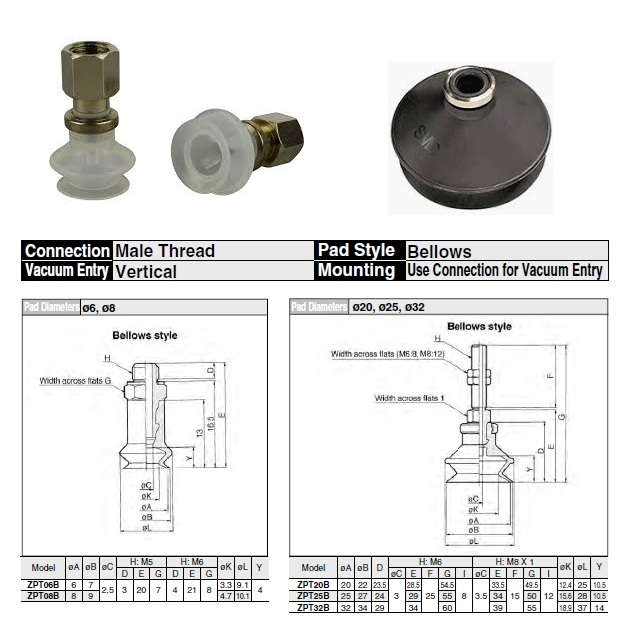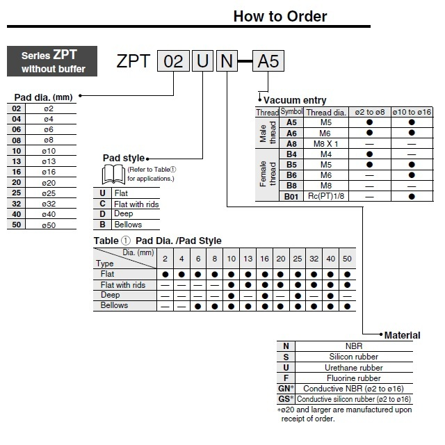 ZPT (B), Přísavka se zajišťovacím kroužkem.Možnosti: vnější, vnitřní závit, přívod vakua v ose.Volitelné materiál přísavky: N: NBR, S: silikon", U "uretan", F: FKM, GN - vodivý NBR, GS: vodivý silikon.Koncové -B01 = Vnitřní Rc 1/8", -B5 = vnitřní M5x0,8, -B6 = vnitřní M6x1...atd. viz katalog.
