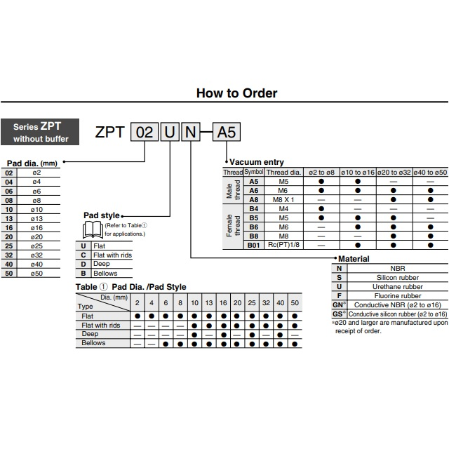 ZPT (U,C), Přísavka se zajišťovacím kroužkem.Tvar přísavky: plochá, plochá s opěrnými žebry.Možnosti: vnější, vnitřní závit, přívod vakua v ose.Volitelné materiál přísavky: N: NBR, S: silikon", U "uretan", F: FKM, GN - vodivý NBR, GS: vodivý silikon.Koncové -B01 = Vnitřní Rc 1/8", -B5 = vnitřní M5x0,8, -B6 = vnitřní M6x1...atd. viz katalog.