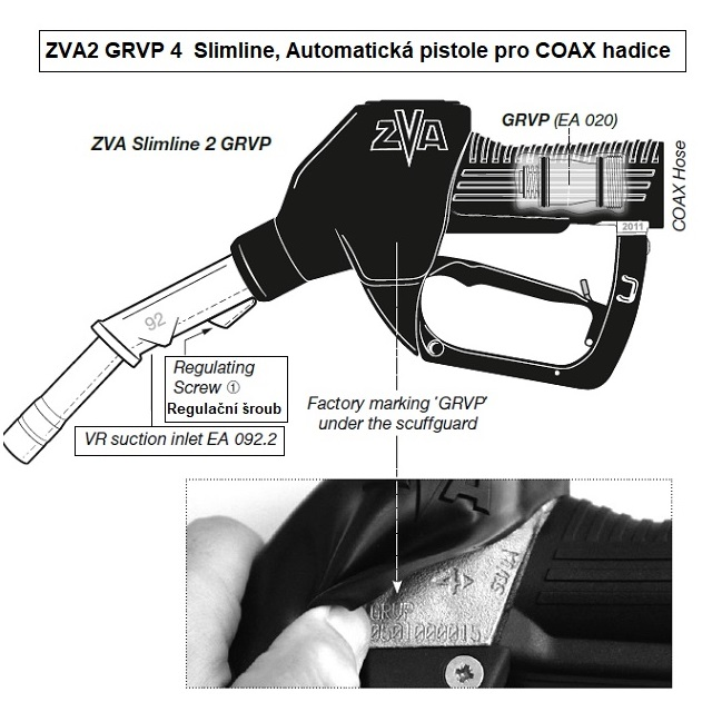Vlastnosti a výhody:Tryska pro rekuperaci výparů pro benzín, také se směsmi etanolu.Plně integrovaný parní regulační venti GRVP (proporcionální ventil) dle vašeho výběru (viz originální katalog).Proporcionální ventily GRVP jsou plně integrované uvnitř a není třeba je přidávat na délce trysky nebo se nemusí hadice upravovat na délce.Funkce proporcionálního ventilu ON/OFF:Bezpečně uzavře páru v potrubí (vnitřní hadici), když již nedochází k průtoku paliva ve velké hadici, která je vedena jedním směrem k pistoli!!Vylepšené vypínání: Nová „inteligentní ventilová kuželka" minimalizuje tlakové špičky a chrání dávkovací systém. Kuželka také zajišťuje zlepšené uzavření i při náročných provozních podmínkách, jako je odpařování nebo pěnění paliv.Barevné produktové pouzdro, které se snadno nasazuje, umožňuje jasnou identifikaci druhu paliva nebo označení trysky firemními barvami.Všechny pistole této skupiny GRV mají koncový průměr tzv. *OD 21 - (velikost trubky hrdla nádrže- benzíny).